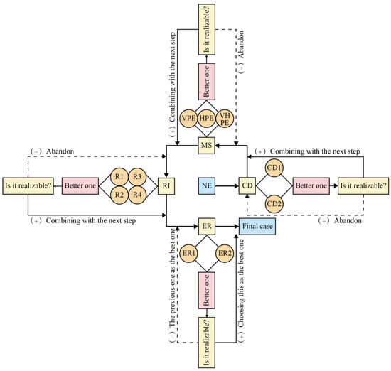 Because stairs are the only vertical means of transportation between floors and the last step in the planar evacuation of each floor of the building, we first modified the stairs to investigate how improvements in the building components of the stairwell affected evacuation times. We then attempted a phased evacuation management approach: (1) a vertical-phased evacuation; (2) a horizontal-phased evacuation; and (3) using both vertical and horizontal-phased evacuation. Those with limited mobility (disabled students, injured students, and elderly teachers) are at high risk during evacuation. In the context of the specific situation, we considered a ramp for these groups and set the elderly teacher lecture classroom at the bottom of the building. As shown in Figure 10, we evaluated and analyzed the results of each scenario measure, selected the most successful strategy among them, and overlaid the best dispositions in each step to finally arrive at the optimal evacuation combination approach.