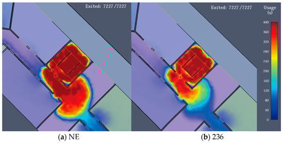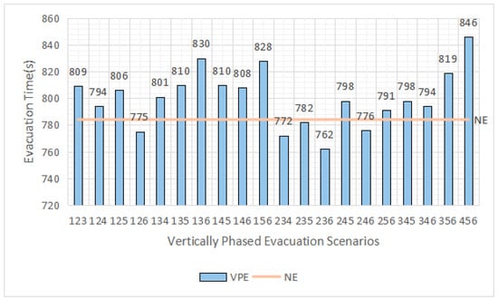 Figure 15 displays the duration of the NE, VPE (236), HPEA, and HPEB evacuations. According to the findings, HPEA and HPEB have faster evacuation times than vertically phased evacuation, decreasing their respective evacuation times by 7.1% and 9.2%, respectively. In teaching buildings with high evacuation loads, planar zoning evacuation is more effective than vertical zoning and can reduce the overall evacuation time. Planar-zoned evacuation can be achieved through fire training for students and faculty [].