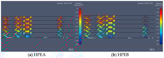 Figure 16 shows that the evacuation time for the scenario HPEB is less than HPEA. This indicates that using both vertical and horizontal zoning is better than using only horizontal-phased evacuation. Figure 15 compares the density of people in the stairwell at 180 s for scenarios HPEA and HPEB. The density of people in the stairwell on each floor is more uniform and has lower values for scenario HPEB. This finding suggests that maintaining a constant population density along the length of the stairs maximizes evacuation efficiency. Although the population density in stairwells between the fifth and sixth floors is higher than that in stairwells on lower floors, this effect has little impact on evacuation performance [].