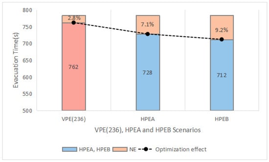 The evacuation times of NE, VPE(236), HPEA, and HPEB scenarios.