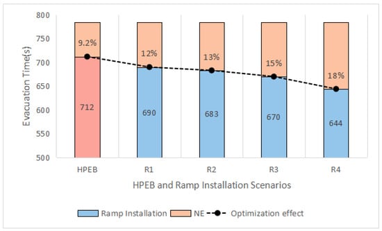 Figure 17 illustrates that installing ramps on buildings is a way to significantly reduce evacuation times. The evacuation time is reduced by 12%, 13%, 15%, and 18% in the R1, R2, R3, and R4 scenarios, respectively, with the R4 scenario showing the best results. Compared to one ramp, the addition of two ramps allows people with limited mobility to access the ramp from classrooms on both sides of the corridor in close proximity. Thus, the main evacuation flow of normal people does not affect the direction of movement of people with mobility impairments, as there are separate corridors for them to use. Also, these physically challenged individuals will not be an obstacle to the evacuation of normal people [].