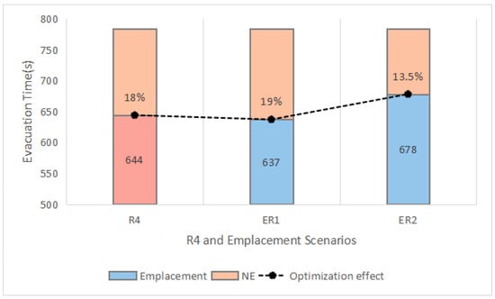 The evacuation times of NE, R4, ER1, and ER2 scenarios.