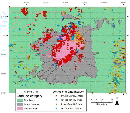 Burnt area fire product MCD64A1 was obtained from NASA’s Land Processes Distributed Active Archive Center (LP DAAC) []. The MCD64A1 from the LP DAAC product combines data from two satellites (AQUA and TERRA) and returns estimated burnt areas monthly based, with a spatial resolution of around 500 m. In this study, the LP DAAC MCD64A1 raster dataset with a spatial resolution of around 500 m was utilized to select burnt areas within the study area (Table A1). Another MODIS Active Fire Data product, MCD14DL-Collection 6, that detected fire occurrences on a monthly basis, was also used in our study []. However, the fact that the spatial resolution of the LP DAAC MCD64A1 for detecting burnt areas is about 500 m and permits the detection of burnt areas with a size bigger than 24 ha should be considered, and those smaller than 24 ha may have been left out of the analysis []. Possible ignition spots in MKFRNP were displayed to visualize the spatial extent of the burnt areas and ignition sites in the three major land use types: NP, FS and FL.