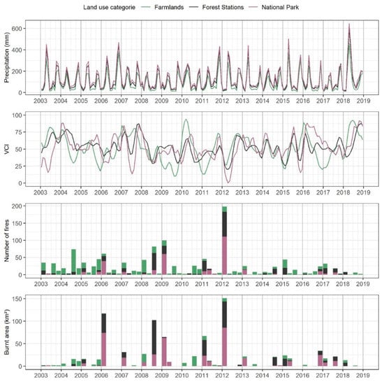 Time series of monthly precipitation and VCI were produced by averaging the monthly values for cells belonging to the same land use category. Time series of seasonal number of fires and burnt areas were produced by summing up the monthly values for cells belonging to the same land use category and season.