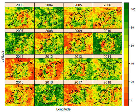 Analysis of the spatio-temporal variability of the VCI showed that the average monthly VCI can vary in space, time and within the same or different land use types, as indicated by previous studies [,]. Therefore, the relationship between VCI, number of fires and burnt areas was analyzed at raster cell level rather than for a whole land use type in the month of February for each year from 2003 to 2018 because it is the most fire-prone month.