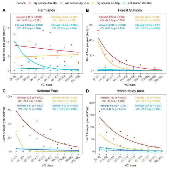 Relationship between vegetation condition and burnt area in each of the land use categories (A–C) and the whole study area (D). The vegetation condition is expressed by Vegetation Condition Index (VCI) classes. Each point represents the average burnt area in square kilometers per year and VCI class recorded during the respective season.