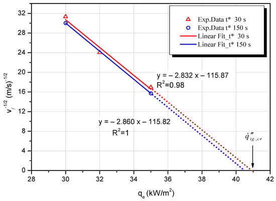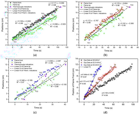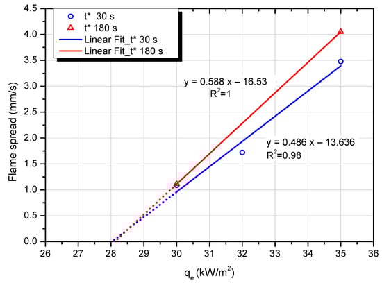 | Heat Flux (kW/m2) | Pre-Heating Time (s) | Flame Spread Rate, vf (mm/s) (Visual) | Flame Tip Spread Rate, vt (mm/s) (Visual) | Flame Spread Rate, vf,T (mm/s) (Thermocouples) |
