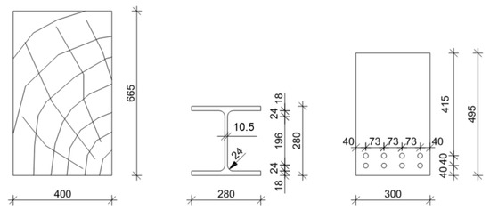 The wood beam has a C30 quality rectangular cross-section, according to EN 338: 2016 standard “Structural timber. Strength classes” [48]. It is important to note that the cross-sectional dimensions of the wood beam are relatively large. They were included in the study only for the purpose of testing. In a real situation, of course, it is not customary to use such a cross-sectional size of solid wood. As for the steel beam, the authors selected a section of the first cross-section class, grade S275. The reinforced concrete beam was taken as a C30/37 rectangular cross-section with two bars of S500B quality at the bottom.