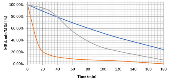 As the next step, the authors examine the changes that occur as a result of the rising temperature. For this, the temperature–time curve must be recorded so that the temperature changes of the cross-sections over time can be followed. The temperature is taken based on the standard temperature–time curve based on the ISO-834 curve (ISO-834 curve) [52,53]. The evolution of temperature as a function of time in the case of the standard temperature–time curve based on the ISO-834 curve is described by the following equation: