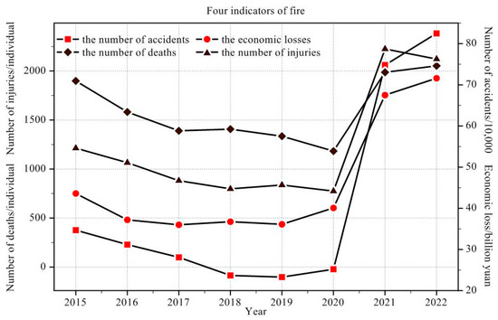 China’s fire four indicators. China fire data in recent years, including the number of accidents, economic losses, deaths, and injuries.