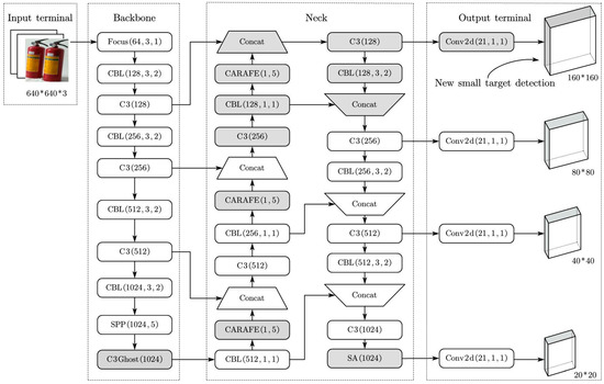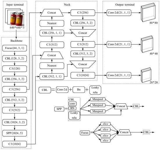 In the Input terminal, an adaptive scaling mechanism is introduced to resize the RGB image to 640 × 640 × 3, reducing information redundancy. The Backbone includes a new structure called Focus, which involves slicing and reconstructing the image. The initial 320 × 320 × 12 feature map is downsampled to create a low-resolution image. This downsampled map is then concatenated with the original feature map to generate a 12-channel feature map. Finally, the 320 × 320 × 64 feature map is transformed to enhance focal points and minimize loss of original image information [18].