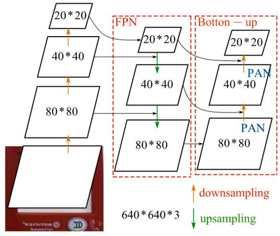 The Neck component adopts the FPN + PAN structure, as depicted in Figure 3, which enables the fusion and integration of features in a hierarchical manner before passing them to the prediction layer. The FPN module propagates essential semantic features from top to bottom, while the PAN module transmits important localization information from bottom to top. By combining these two modules, the model can aggregate Parameters across different layers, resulting in enhanced semantic understanding and precise localization capabilities.