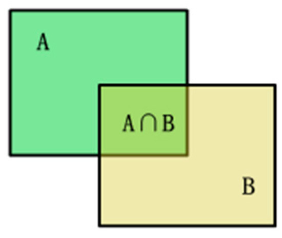 The predicted box is assumed to be A, and the true box to be B. IoU is used to measure the overlap degree between the predicted box and the real box in target detection. The IoU block diagram is shown in Figure 4, and it is expressed using Equation (9).