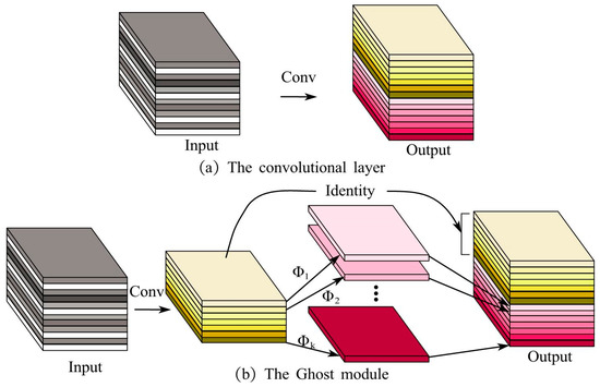 Ghost convolution frame diagram. (a) is the ordinary convolution, and (b) is the Ghost convolution. In Ghost convolution, a part of the feature map is generated via the ordinary convolution operation with fewer convolution kernels, and then another part of the feature map is generated via simple calculation and is finally concatenated to achieve the effect of increasing channels and expanding features.