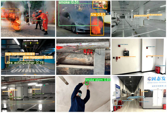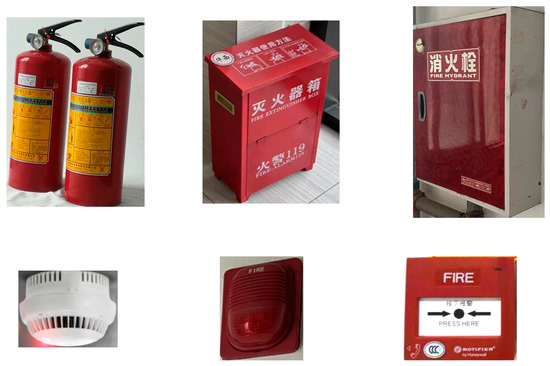 The dataset is the basis of object detection in deep learning. How to make the model have better robustness and generalization depends on whether the provided dataset is superior. In view of the lack of existing datasets and only two types of fire and smoke, it is proposed to add the detection of common fire safety tools to fire prevention detection, as shown in Figure 9, and a fire safety dataset with more scenes and more complex types is produced. Datasets of common fire safety tools are few and far between, and various kinds of collection are used to make datasets for innovation. Regional environmental fire detection can be carried out before the fire, and a set of datasets can be made by collecting images of flames, smoke, and common fire safety tools.