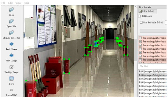 Approximately 500 high-definition (HD) images were collected for the dataset, obtained through both photography and online crawling. To enhance the image data, various techniques such as brightness enhancement, contrast enhancement, multi-angle rotation, and image inversion were applied. Additionally, non-fire-related images were included as negative samples to improve the overall accuracy of the training process. LabelImg software was used to mark the maximum external rectangular box for each data sample, as demonstrated in Figure 10 and Figure 11. The dataset consists of eight categories listed in order: fire, smoke, fire hydrant, fire extinguisher box, fire extinguisher, smoke alarm, manual fire alarm call point, and warning lights. These categories encompass their respective defining features, and annotations were completed to generate XML files. Subsequently, these XML files were converted into TXT files to be read by the YOLO algorithm.