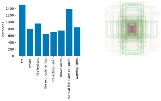 Finally, a total of 4679 fire safety datasets were sorted out and randomly divided into training set, validation set, and test set according to the ratio of 7:2:1. The training statistical analysis was carried out on the dataset, including label types, number of labels, and labeling borders, as shown in Figure 12. We can see that the training targets are divided into eight classes, and the number of classes they contain is plotted. The label bounding box on the other side indicates the size of the corresponding object. The larger the target, the larger the label bounding box. The center is darker, indicating that smaller targets have more numbers.