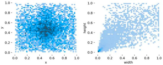 We then analyze the label distribution position and size, as shown in Figure 13. The ratio between the abscissa of the center of the label and the width of the image is represented by the abscissa x, and the ratio between the ordinate of the center of the label and the height of the image is represented by the ordinate y. The closer to the edge, the smaller or larger the value is. It can be seen that the image is concentrated in the middle, indicating that the data distribution is wide. The ratio between the label width and the image width is represented by the abscissa width, and the ratio between the label height and the image height is represented by the ordinate height. The higher the number is, the darker the color is. It can be seen that the image is concentrated in the lower left corner, indicating that the small target has more data, which is in line with the actual size of the fire safety class. At the same time, it contains a certain amount of other data of various sizes, which ensures the generalization of the overall mode.