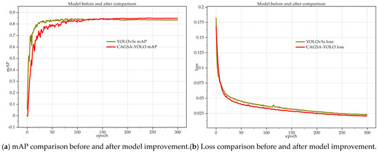 This is a comparison of the model before and after. It can be seen from (a) that although CAGSA-YOLO has a slower increase in mAP than the original model at the beginning, it has a higher accuracy in the end. In (b), it can be seen that the loss of the improved model decreases faster, and it is smaller, which indicates more accurate detection.