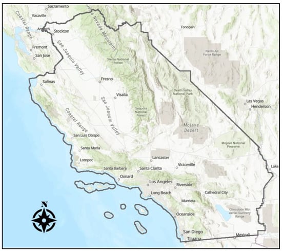 This analysis focuses on the Geographic Area (GA) boundaries defined for Southern California (Figure 1), referred to herein as the Southern California Geographic Area (SCGA) for simplicity. GA boundaries are designated by intergovernmental wildland fire protection agencies for “planning, coordination, and operations leadership for effective utilization of emergency management resources within their area [24].” There are ten such GAs throughout the United States. GA boundary shapefile data were collected from the National Wildfire Coordinating Group (NWCG).