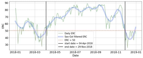 Energy Release Component (ERC) time series for calendar year 2018 over the Southern California Geographic Area (SCGA), including daily values (thin green line), Savitzky–Golay filtered values (ERCSG; thick blue line), and the beginning and end of the “fire season,” as determined by the consecutive period where .