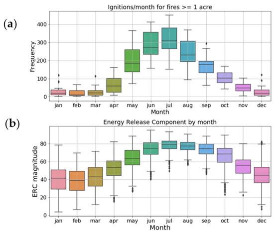 Box-and-whisker plots of SCGA monthly (a) fire ignitions and (b) ERC magnitude, two of the components used in the Annual Fire Severity Index (AFSI) calculation, for the study period 1992–2018. Boxes indicate the 25th, 50th, and 75th percentiles of the distribution, whereas the whiskers extend to the 5th and 95th percentiles. Black dots indicate outlier values.