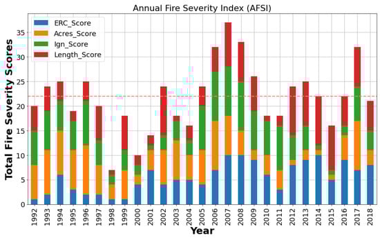 The calculated AFSI time series for study period 1992–2018. Each of the four AFSI components are indicated by different colors (ERC, blue; acres burned, orange; ignitions count, green; and fire season length, red). Yearly component scores are stacked to indicate the yearly sum score. The 27-year mean value, 21.85, is displayed as the horizontal dashed line.