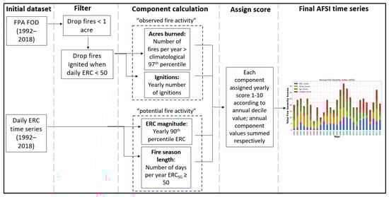 Our AFSI comprises annual values of each of the four components, two derived from the FPA FOD (acres burned, ignition counts) and two derived from the ERC database (ERC magnitude, fire season length). These four components were preliminarily selected based on their perceived ability to quantify different but equally important modes of annual wildfire severity related to observed fire activity (which contain an element of anthropogenically-derived stochasticity) and potential fire activity (which are related only to atmospheric conditions and the attendant impacts on fuel flammability). Each of the four metrics were established throughout the fire science community and can be easily attained and interpreted.