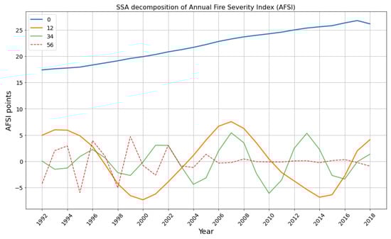 SSA is also practical and easy to employ because it requires only one variable, the “window length,” or the number of consecutive time series observations n upon which a delay window is applied, and determines the longest periodicity captured by SSA. Given a window length of L, SSA produces L principal components. Larger values of L provide more refined decomposition into elementary components and therefore better separability [46]. To sufficiently extract the underlying trend of the AFSI, a window length of was chosen. Therefore, the window length consisted of about 44% of the overall study period length. The SSA code implemented herein was adapted from a Python script by D’Arcy [47].