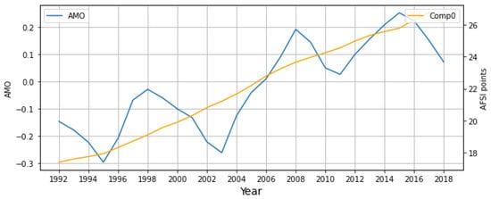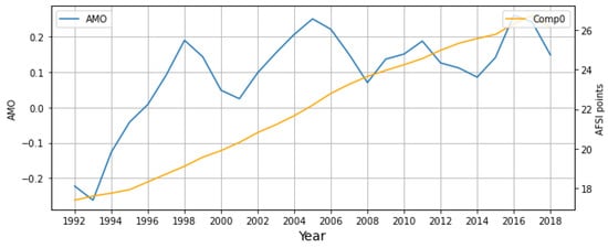 Yearly Atlantic Multidecadal Oscillation (AMO) Index (SG filter, window length months and polynomial order ) vs. Comp0 time series for the 27-year study period, 1992–2018.