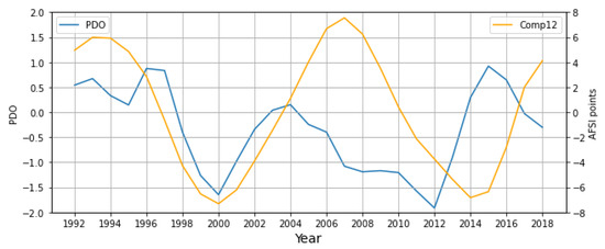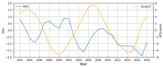 Yearly Pacific Decadal Oscillation (PDO; SG-filtered, window length months and polynomial order ) vs. Comp12 time series for the 27-year study period, 1992–2018.