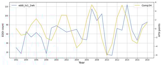Yearly Evaporative Demand Drought Index (EDDI) threshold exceedance counts (# of times per year ) vs. Comp34 time series for the period 1992–2018.