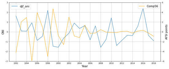 Yearly December–February mean Oceanic Niño Index (ONI) vs. Comp56 time series for the period 1992–2018.