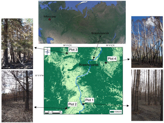 Map of the locations of the study sites and views of burned Scots pine (Plot 1), larch (Plot 2), spruce (Plot 3), and birch (Plot 4) forests. Forested lands according to the product of Hansen et al. [27] are shown in green.
