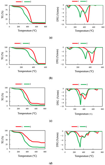 TG (left) and DTG (right) curves of PyOM (1) and unburned (2) samples of stem bark from a Scots pine forest (a), cone from a larch forest (b), down wood from a spruce forest (c), and forest floor from a birch forest (d).