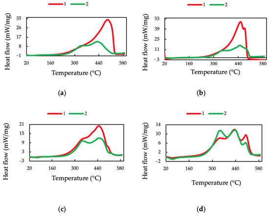 DSC curves of PyOM (1) and unburned (2) samples of bark from a Scots pine forest (a), cone from a larch forest (b), down wood from a spruce forest (c), and forest floor from a birch forest (d).