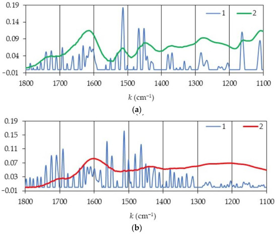 Fragments of the second derivatives of FTIR spectra of unburned bark (a) and bark PyOM (b) from a Scots pine forest. 1—the second derivative (−∂2A/∂k2); 2—absorbance; k—wavenumber.