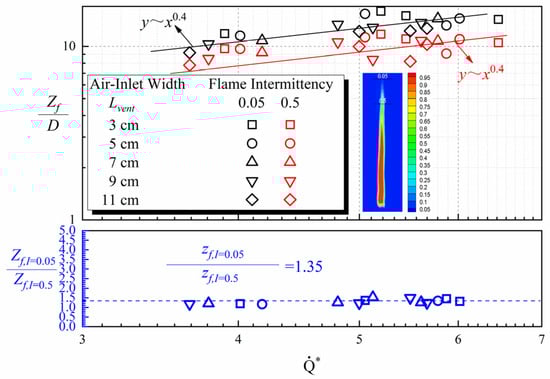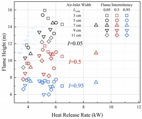 - These three dimensionless parameters of flame height (maximum, average, continuous) each have a power-law relationship with the dimensionless heat release rate (), denoting the primary control mechanism of a three-dimensional axially symmetrical flame whirl [39,40]. This aligns with the correlation between flame height and heat release rate as proposed by Sun [41]. The distribution of the continuous and maximum flame heights near the fitting curve appears more discrete than the average flame height, potentially due to the flame’s periodic fluctuations, leading to certain measurement errors.