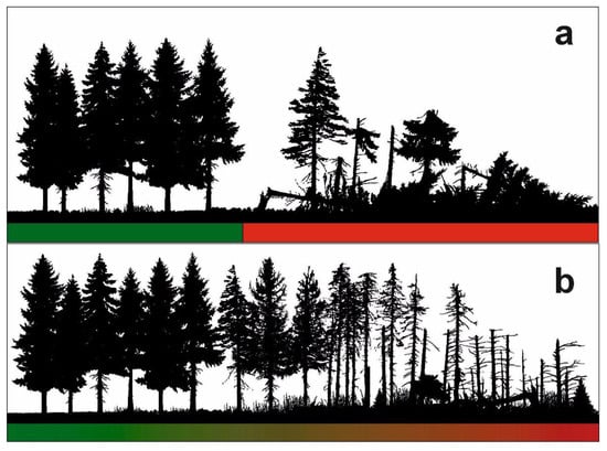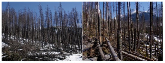 Similar to wind disturbance events, bark beetle outbreaks also significantly change the characteristics of the forest environment (Figure 3). During the first phase of a bark beetle outbreak, the infected trees experience drying and shedding of the needles, which is usually accompanied by the shedding of the bark. The surface of the forest floor is therefore covered with a significantly larger amount of flammable material than the floor of a healthy forest stand [,]. Then, small twigs break off of dry trees and further increase the amount of flammable material on the forest floor; later, the stronger branches break off and fall to the ground. In addition, there may be uprooted or dry individual trees and a further increase in the amount of flammable material on the surface of the forest floor (Figure 1) [,,,]. The amount of transferred flammable material depends on the period between the destruction of the forest stand by the bark beetles and the salvage logging in the stand. However, even after the relatively quick removal of trees, more combustible material remains on the floor than in the case of harvesting a healthy stand, mainly in the form of bark, broken branches, and the remains of the assimilation apparatus.