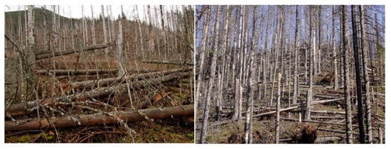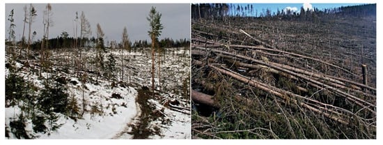 If the quantity of damaged wood in wind-disturbed areas is too great to be cleaned and processed in a timely manner, the population of bark beetles is likely to increase [,]. Damaged trees provide an optimal habitat for developing bark beetle populations, and outbreaks often follow wind disturbance, especially where weather conditions are suitable for the reproduction and survival of beetles. Both types of disturbance often support each other, or one follows the other and leads to cascading disturbance effects on forest ecosystems [,,,,]. One example is the bark beetle outbreak in High Tatras National Park (Slovakia) in 2005, after a wind disturbance event in 2004 (called Bora or Elizabeth) [,]; another is the outbreak in Bohemian Forest National Park (Czech Republic) in 2008 because of the storm Kyrill that occurred the previous year [].Even spontaneously developed forest stands have not yet fully recovered from bark beetle outbreaks [].