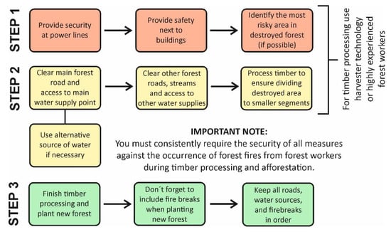 From a forest fire perspective, the basic principle for decreasing the fire danger is the reduction in the fuel load in the area affected by the disturbance by removing the damaged timber as quickly as possible []. We recommend the following procedures to reduce the risk of injuries to workers during salvage logging, significantly reduce the fire danger, and increase preparedness for a possible forest fire (Figure 4).