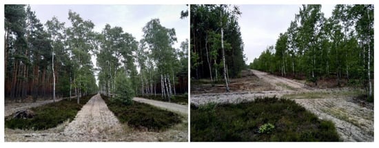 However, a fire in these areas is less dangerous and easier to control and suppress due to the completed processing of timber (Figure 5a) []. Access and movement around the fire during suppression are also easier in the case of cleared areas.