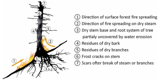 Depending on the type of habitat, natural regeneration processes, and thus the rate of decomposition of the most flammable material, it can take 5 to 10 years and occasionally much longer [,]. Many studies have indicated that lying deadwood from wind disturbance can reduce browsing pressure on young seedlings due to the barrier effect []. On the other hand, in bark beetle-destroyed forest stands, due to increased sunshine and decreased shadow, there is a decrease in natural humidity in the area, which affects various organisms and leads to a slowing of the decomposition processes of the accumulated flammable material []. Another problem in relation to forest fires lies in the gradual drying out of standing dead trees due to alternating precipitation, sunshine, frost cracks, or partial breaks (breaking off of branches and tree tops). The integrity of the tree trunk is gradually weakened, and the area of surfaces suitable for heating and burning increases (principle of woodchips). In the case of a forest fire, the entire standing trunk can gradually burn, as demonstrated in Bohemian Switzerland National Park (Figure 8). Research carried out in the Polish complex of the Białowieża Forest damaged by bark beetles showed that approximately 10 years after dying, dead spruces were practically devoid of branches. Some of the dead trees were lying, and some were still standing; however, they did not pose a significant threat to the spread of fires. The same research years before showed that in the first 3 years after dying, the trees were mostly standing and had most of their branches. As a result of the systematic falling of trees and branches, a loose spatial structure is created that allows grass-like vegetation to develop on the ground. Grass cover poses a serious danger for fire ignition and rapid spread. When analyzing the decay of the spruce stand over time, researchers found that the susceptibility of potentially combustible material to ignition and fire spread was highest in the initial phase and reached a maximum in the 2nd to 3rd year. (This chapter is supported by long-term research in Bialowieza Forest see, [,,,]).
