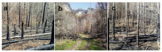 Furthermore, it is highly recommended that certain sections be completely cleared of all destroyed timber for the building of partial fire breaks, namely, along the main forest roads and in places that are easily accessible to fire brigades; this will also make disturbed areas less complex. These cleared areas must be wide enough (at least 30 to 50 m, ideally even more); sufficient width should ensure a momentary reduction in fire intensity, which can be advantageous when trying to suppress a forest fire [,,,]. Cleaning up the surroundings of these main forest roads in spontaneously developing forests will also ensure greater safety for future visitors [,]. To make this beneficial for stopping the spreading of fire, a small effort must be expanded to build firebreaks.