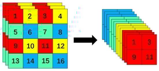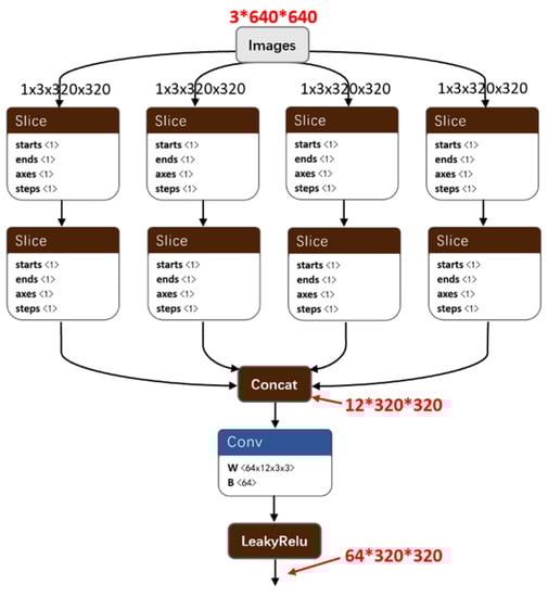 YOLOv5 adds a focus framework to the network (shown in Figure 2). The most critical step in the focus framework is slicing. A 4 × 4 × 3 image is transformed into a 2 × 2 × 12 feature map after slicing. In the YOLOv5 network, the original 3 × 640 × 640 image is fed into the focus framework. After the slicing operation, it first becomes a 12 × 320 × 320 feature map and becomes a 64 × 320 × 320 feature map (Figure 3) through the convolution operation of 64 convolution kernels.