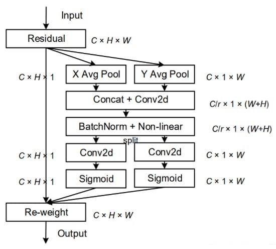 Recently, attention mechanism modules have been utilized on a large scale in computer vision. The attention mechanism aims to find the information of interest and eliminate ineffective information. Most attention mechanisms are used in deep neural networks, which can lead to performance improvements. Currently, the commonly used attention mechanisms are SE [], BAM [], and CBAM []. Nevertheless, SE only assumes the internal channel information while neglecting the necessity of position information, although the target’s spatial framework in vision is very important. BAM and CBAM try to present location information by global pooling across channels. Nevertheless, this method can only capture local information and cannot attain long-range dependency information. Therefore, this study introduces a flexible and lightweight attention mechanism (coordinate attention) into the method []. Coordinate Attention (CA) is a novel attention mechanism presented by Hou et al., where embedding location information into the channel attention allows the neural network to attain information from a broader area and reduces the computing power requirement. The CA module mainly sustains a channel relationship and long-range encoding via accurate location information. It is categorized into two stages: coordinate information embedding and coordinate attention production, as presented in Figure 6.