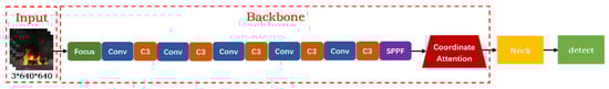 CA decomposes channel attention into two one-dimensional feature-encoding processes aggregating features along 2 spatial orientations. Accordingly, long-range dependencies can be captured along a spatial orientation, while accurate location information can be maintained along the other. The produced feature maps are encoded as direction-aware and position-sensitive attention maps, respectively, which can be applied complementary to the input feature maps to improve the description of objects of interest. We added coordinate attention to the backbone network. Figure 7 presents the enhanced network framework.
