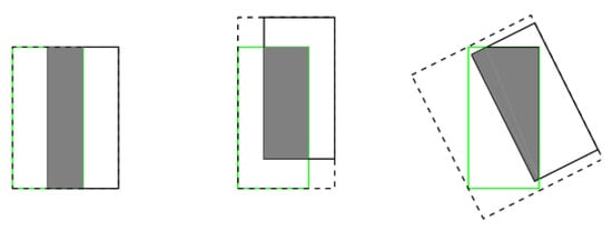 The full name of IoU [] is the intersection over union employed to calculate the ratio of the intersection and union of the “predicted bounding box” and the “true bounding box”. IoU is an important function of mAP calculation of the object-detection algorithmic performance. It is a precision measure when identifying the corresponding objects in a given dataset. When the predicted bounding box is closer to the ground truth bounding box, the IoU is closer to 1. By continuously reducing the loss, the model obtains better prediction results. However, IoU does not assume the distance between boxes, and it has corresponding drawbacks when employed as a loss function. For example: if the two borders do not overlap, the IoU is 0, and no gradient will be returned at this time; multiple iterations are required, and learning cannot be performed. Loss is only related to the intersection ratio and intersection area of the two boxes. Therefore, a phenomenon of the same intersection area and different coincidence degrees will occur, as shown in Figure 8.