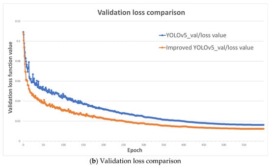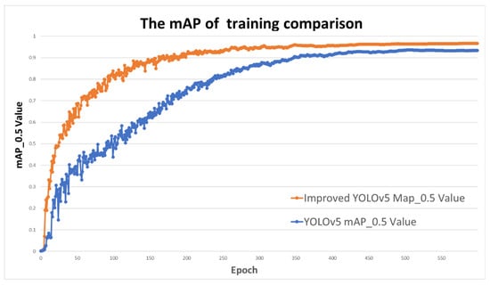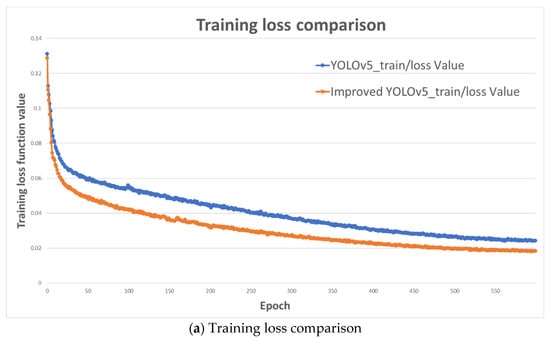 We combined the loss function curve and the mean precision to judge the detection model’s quality. In the network training process, the loss function can intuitively indicate whether the network model converges stably with increased iterations. Figure 10 presents the model loss function. Experiments showed that the convergence rate of the loss function of the improved YOLOv5 approach is higher than the original YOLOv5 algorithm. Moreover, when the improved YOLOv5 algorithm iterated 300 times in the model, the loss value was close to 0, meaning the network basically converged.