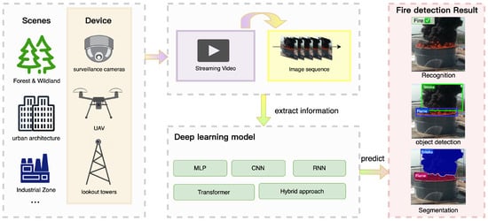 The framework of video-fire-detection methods based on deep learning. The process commences by collecting video sequences from diverse camera devices and extracting pertinent information from these sequences. Subsequently, this extracted information is fed into a deep learning model network for fire detection, ultimately leading to recognition, object detection, or segmentation outcomes.